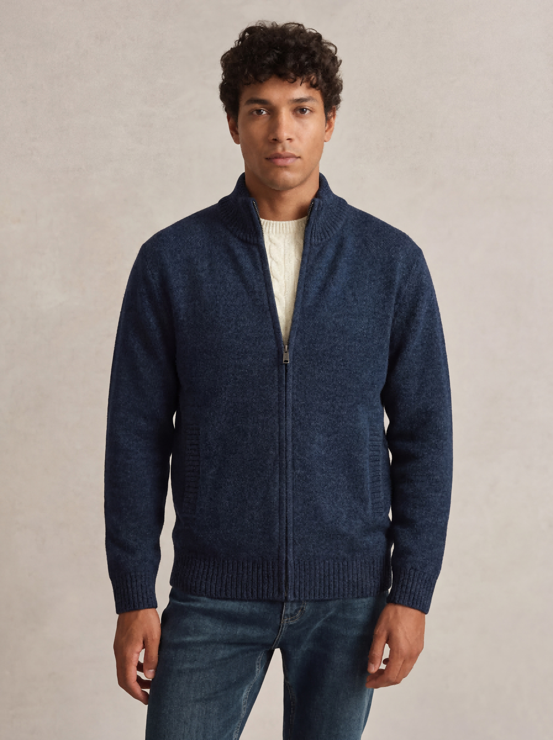 This men’s knit jacket is made from 100% polyester with a fleece-lined interior, offering excellent warmth. The stand collar and front zipper combine practicality and style, making it ideal for daily wear in autumn and winter.